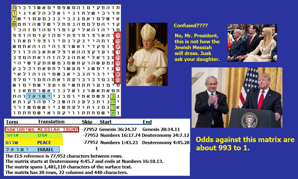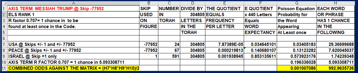 Initially I looked for both MESSIAH TRUMP and TRUMP MESSIAH as the 9-letter axis term. I found each. But although the ELS rank of MESSIAH TRUMP was #2, the TRUMP MESSIAH sequence had ELS rank #1. However, MESSIAH TRUMP was paired with three key words at special case skips. This axis term has the same skip (-77,952) as USA and PEACE. ISRAEL is in the open text (at skip +1). With ELS rank #2 factored in, and with an axis term R Factor of 0.707 which equates to a 19.63 % chance for MESSIAH TRUMP to be found at least in a 440-letter wrapped matrix, odds against finding this matrix were about 992.96 to 1.