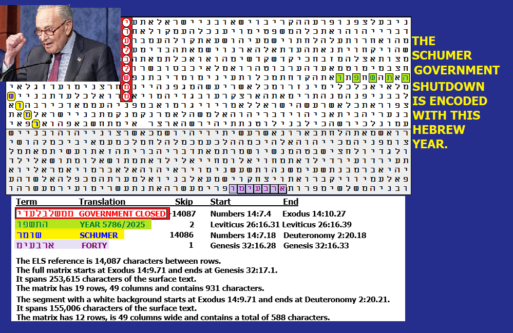 This page is under construction. On October 1, 2025 the Democrats led by Senator Chuck Schumer shut down the U.S. Government for what looks like at least 40 days causing millions of Americans to go without pay. Those hurt included all of the U.S. military. As is shown elsewhere on this site and in my book God, Aliens and Artificial Intelligence, Who wrote the Torah Code, the Torah Code seems to indicate that Schumer is a Reptilian Shapeshifter, who is a hostile enemy of our Government, but here we will largely just look at his role in attacking all of America economically. The axis term at skip -14,087 is GOVERNMENT CLOSED (or shutdown). At skip +2 is the current Hebrew year, 5786 (2025). SCHUMER is at one skip off that of the axis term (14,086). That is all in 588 letters with a white background. If this matrix is expanded to 931 letters, then FORTY shows up a skip +1.